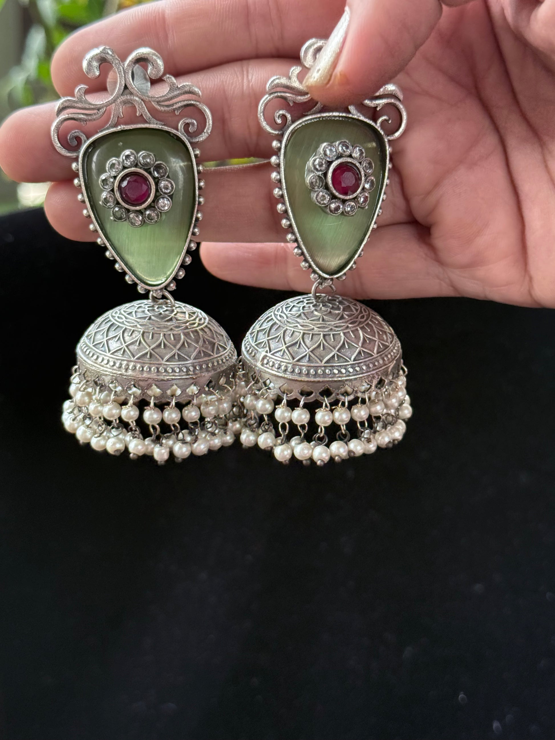 A striking blend of antique silver and golden amber hues, these jhumkas feature a ruby-red centerpiece surrounded by shimmering stones and cascading pearl droplets — a timeless choice for festive and elegant occasions.