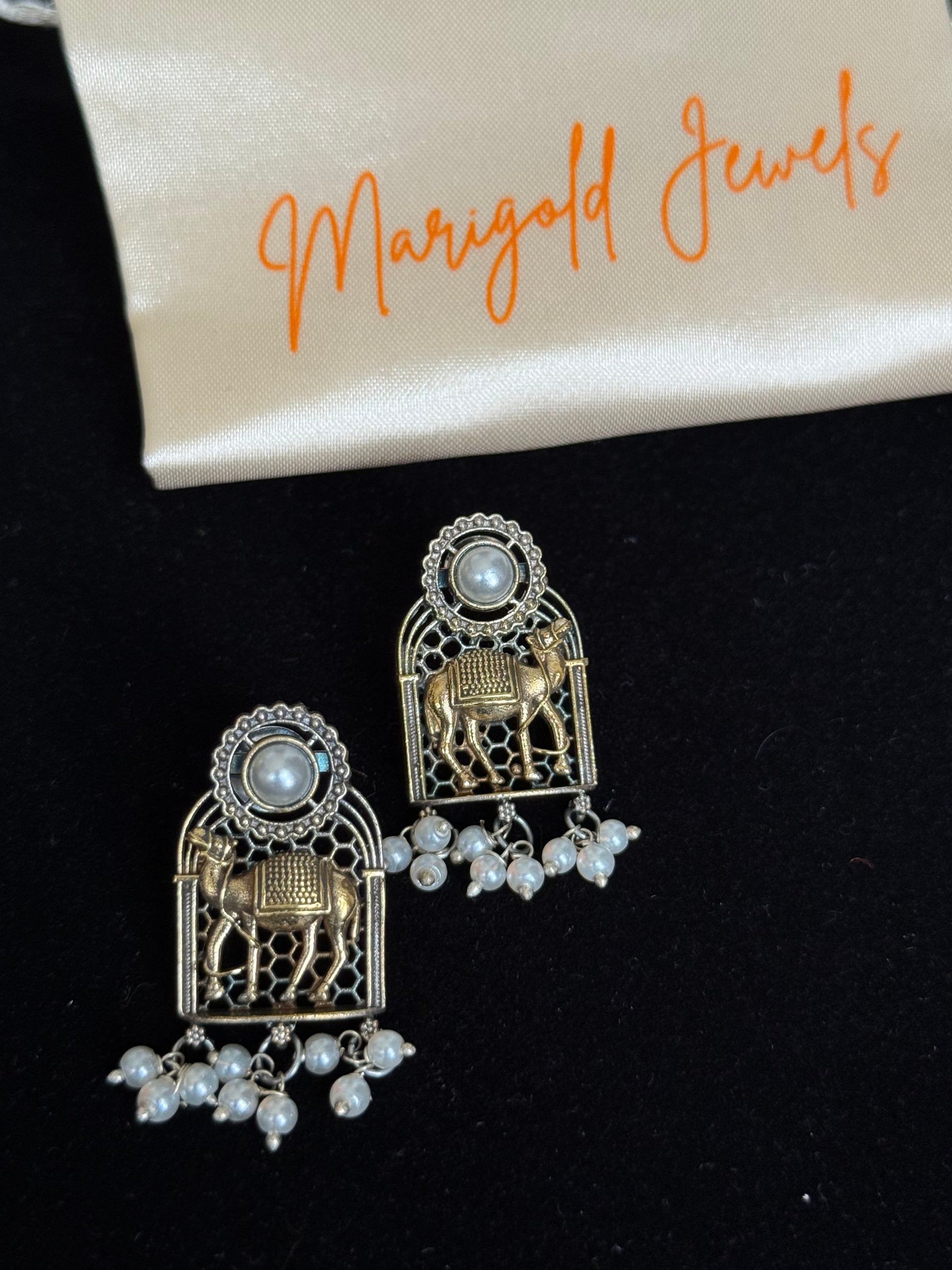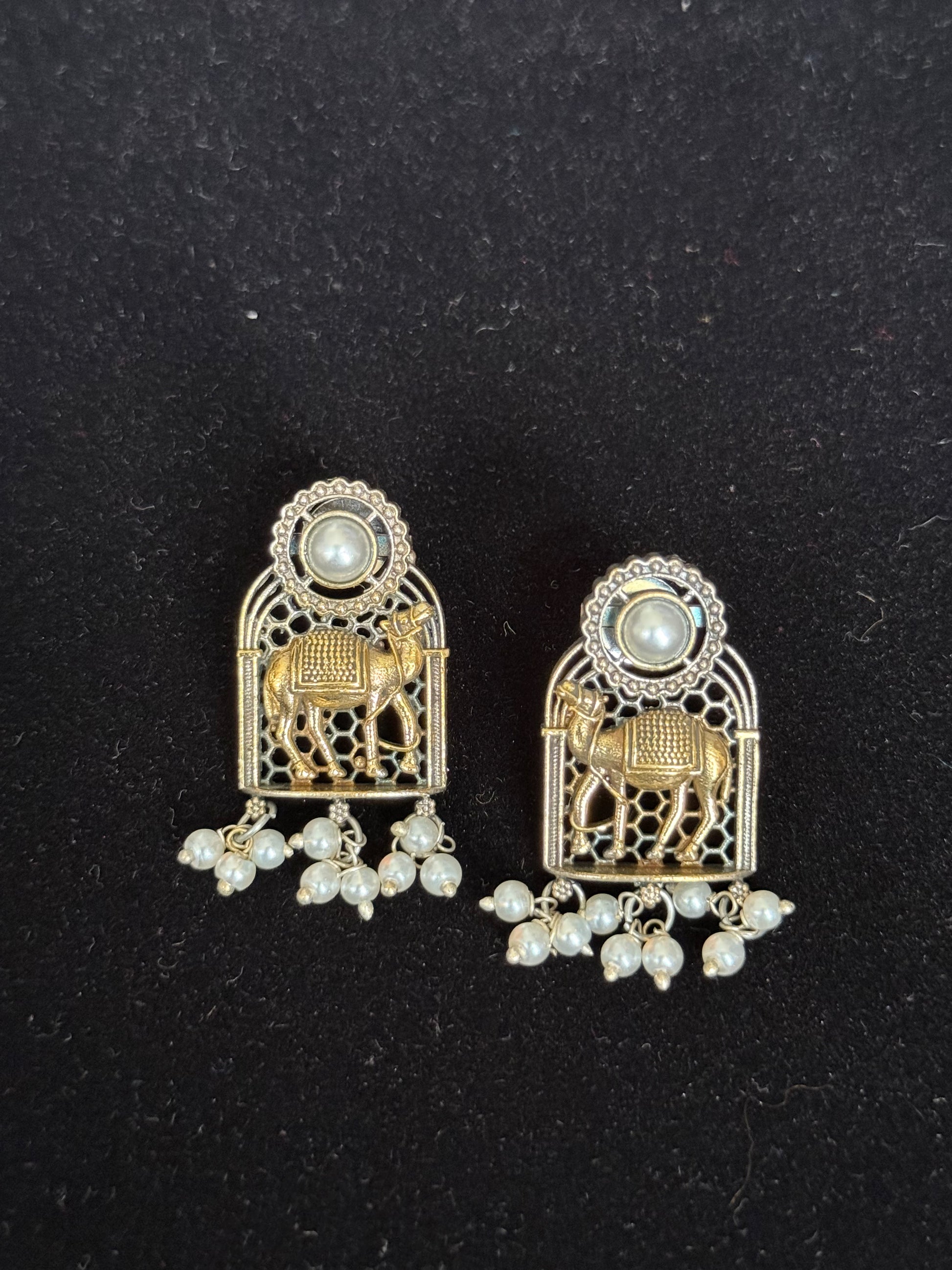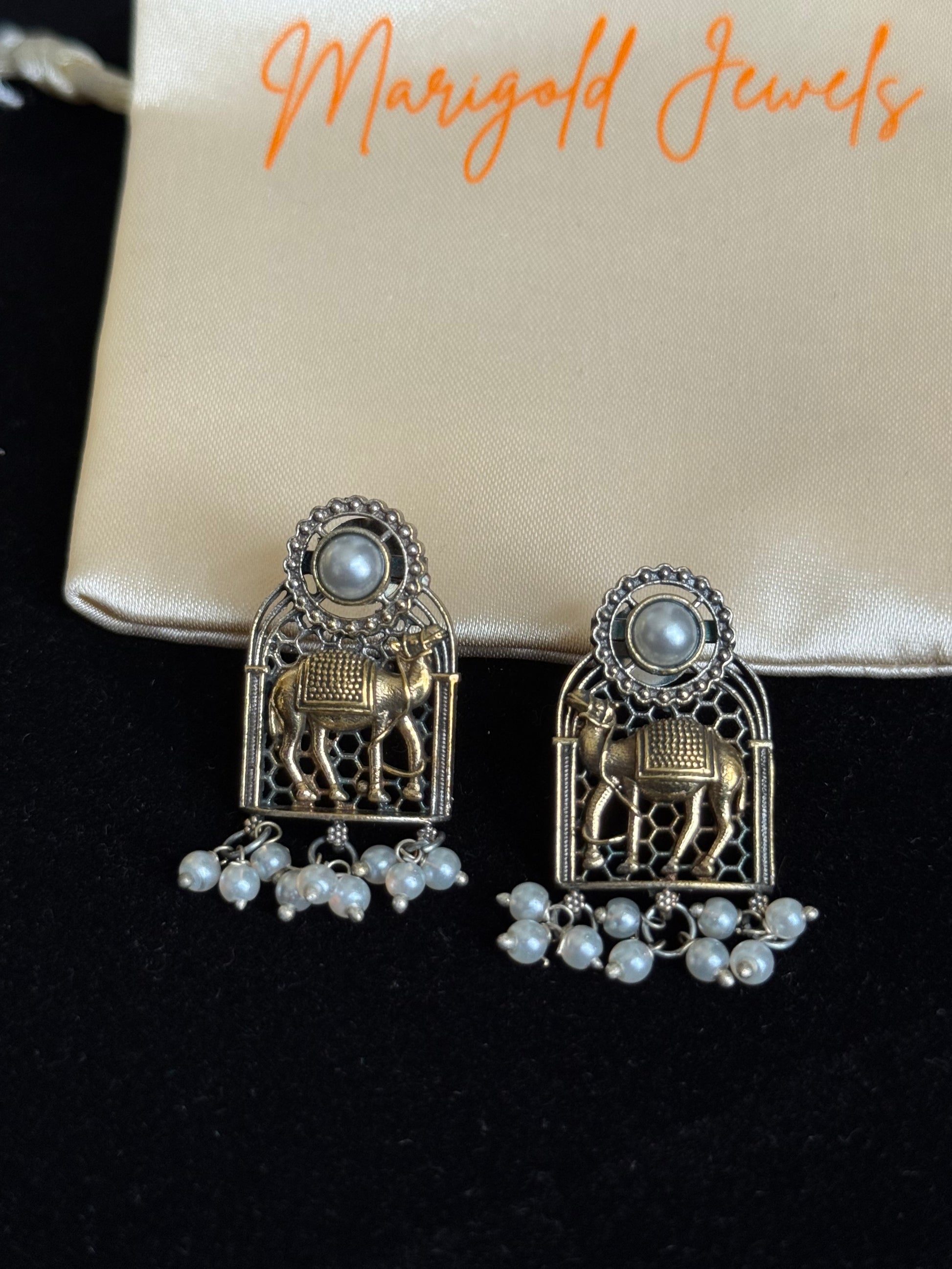 Antique-finish studs featuring a royal camel motif, highlighted with pearl accents and delicate danglings — a perfect blend of heritage and charm.
