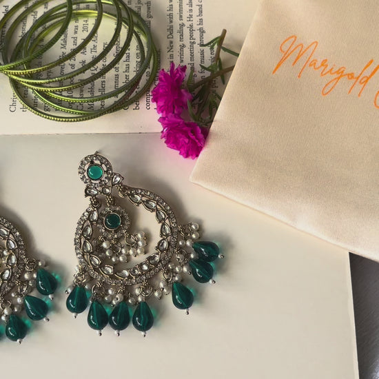 Drenched in regal charm, these chandbali earrings bring together the timeless grace of kundan with the refreshing allure of emerald-green drops. Intricately studded with shimmering stones and delicate pearl clusters, they sway with a soft rhythm of elegance. Perfect for weddings, festive soirées, or when you want your look to whisper royalty, the Emerald Raaga Chandbalis are an ode to tradition with a touch of modern allure.