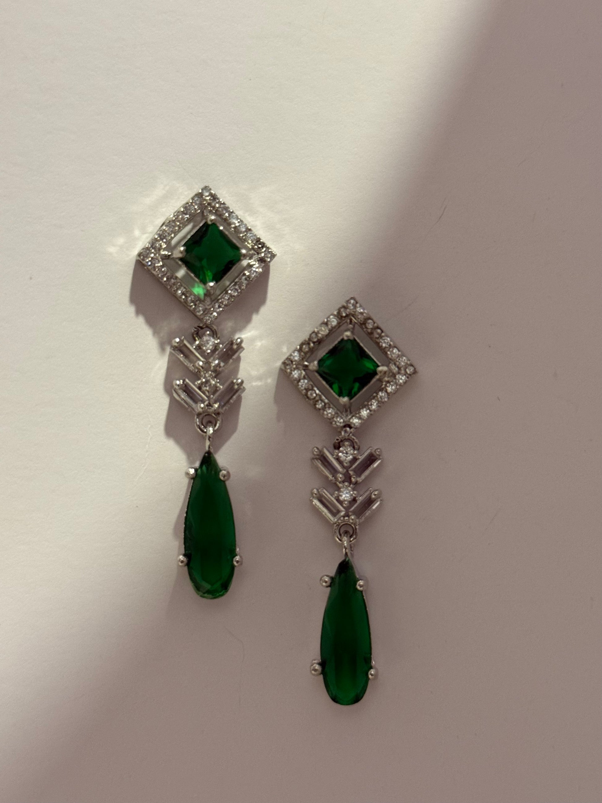 Exuding timeless sophistication, the Emerald Royale Diamond Drops feature rich green emeralds framed by brilliant diamonds in an elegant drop silhouette. The structured geometric detailing enhances the depth of the gemstones, creating a refined balance of classic luxury and modern design.
