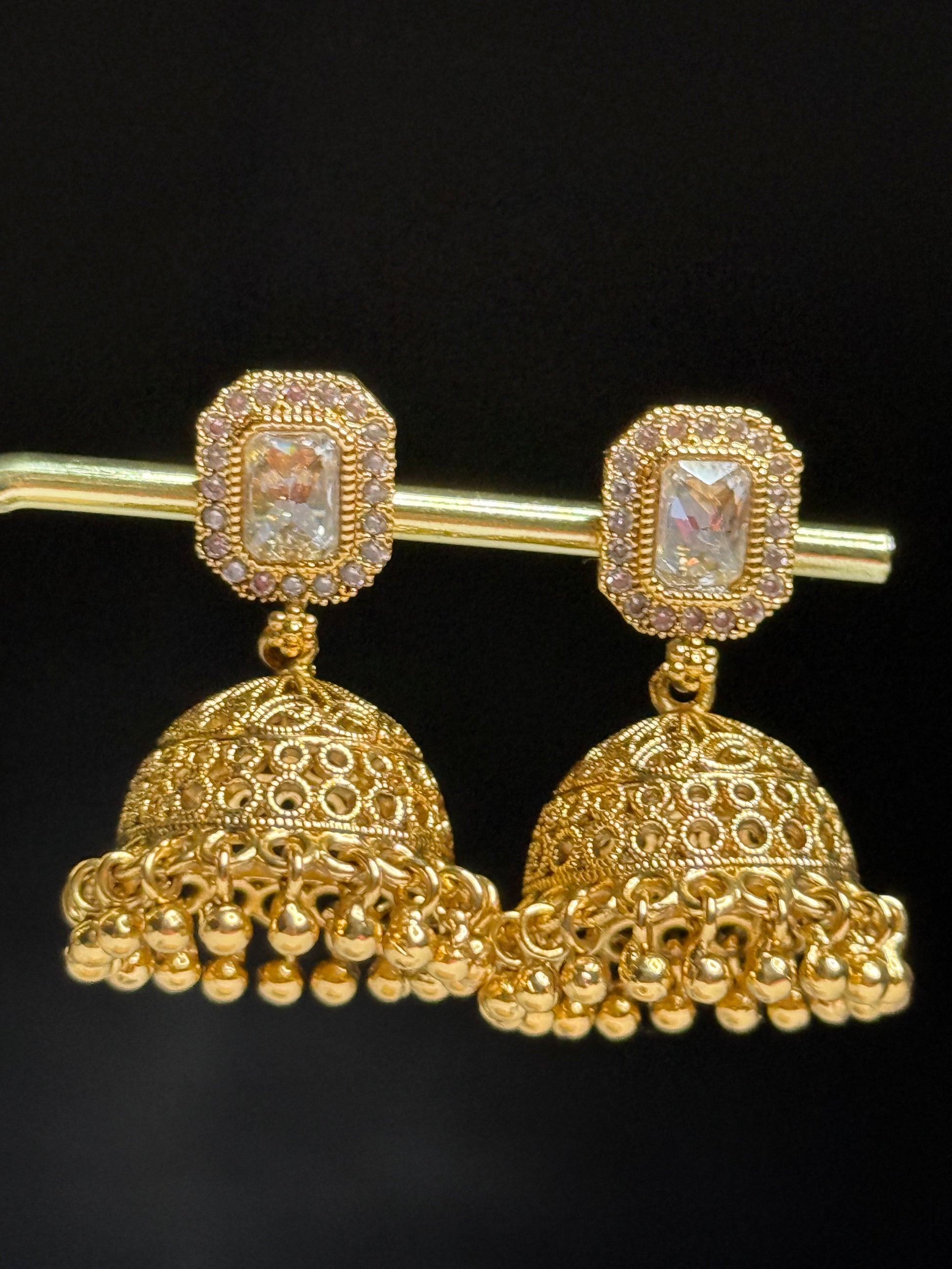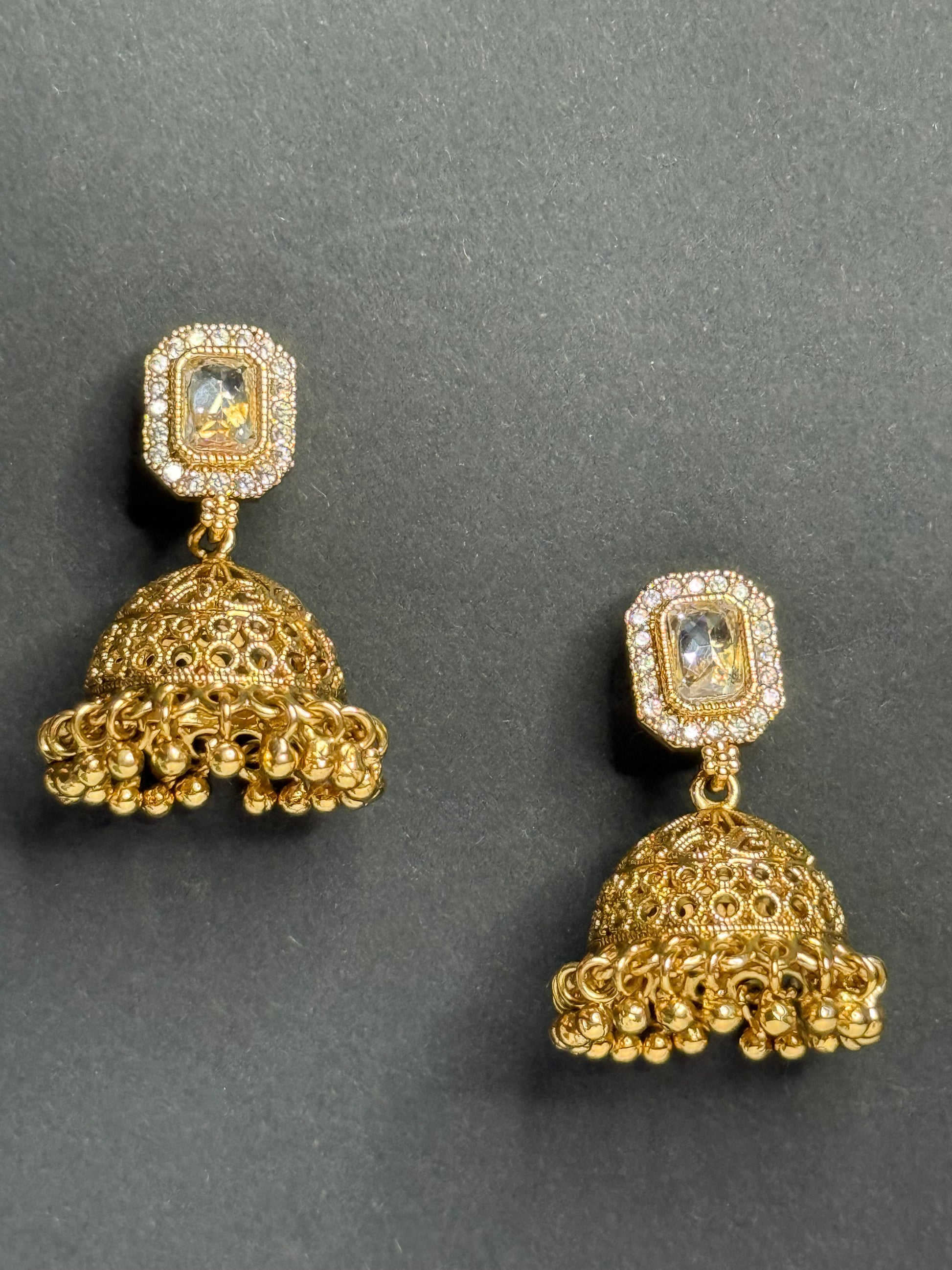 Add a regal touch to your ethnic ensemble with these beautifully crafted gold-tone Jhumka earrings. Featuring a sparkling rectangular stone stud top, detailed filigree dome, and traditional ghungroo-style danglers, these earrings are perfect for festive and wedding wear.