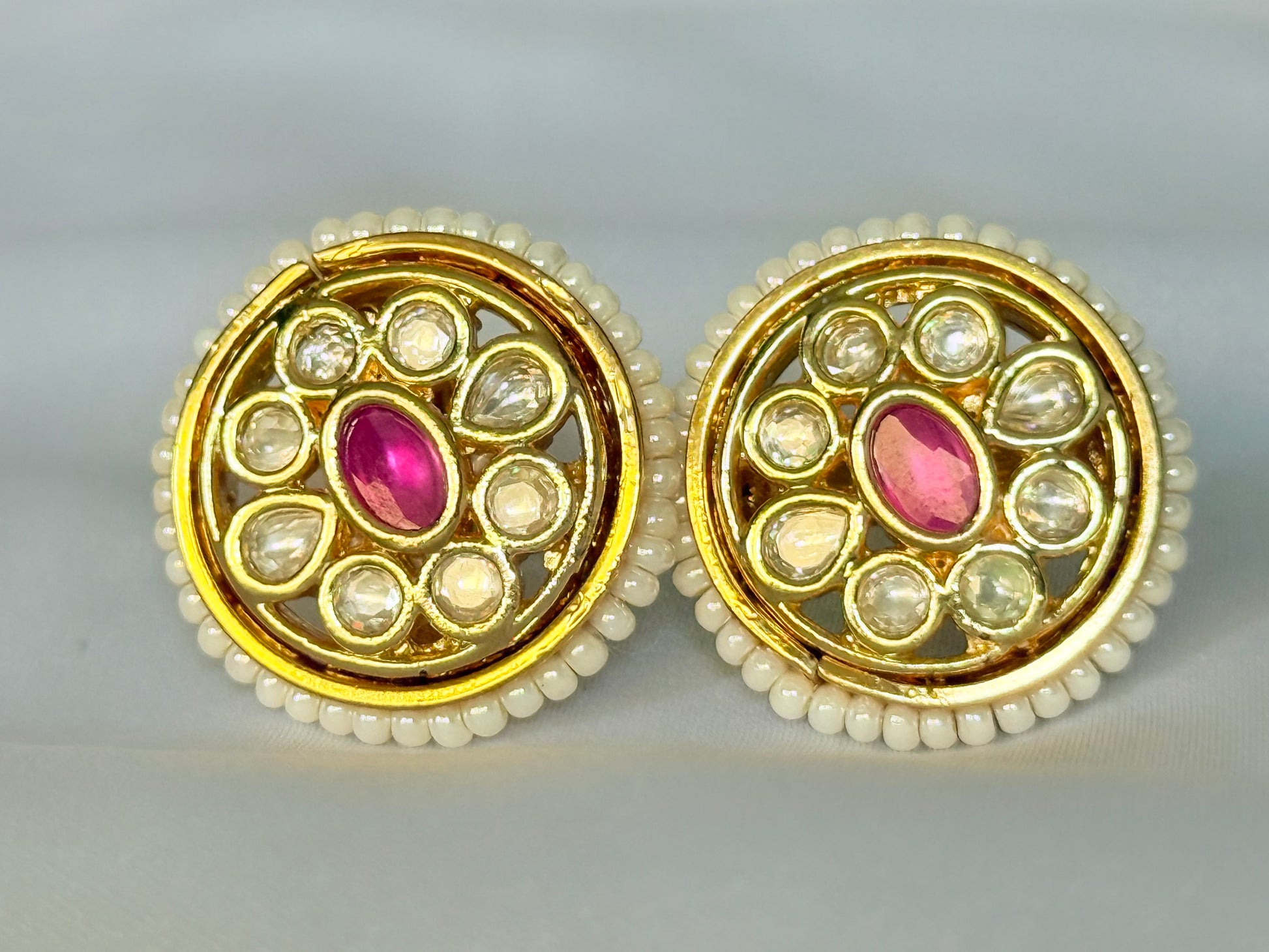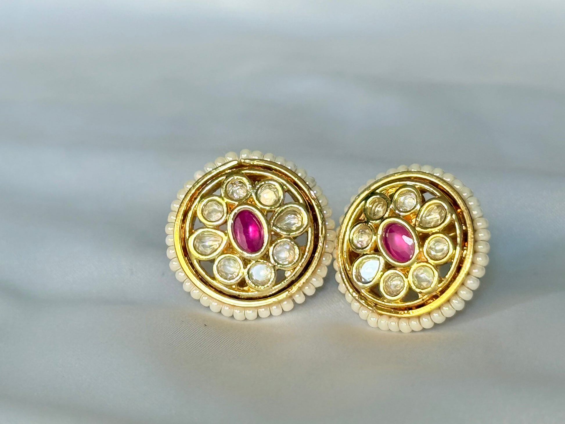 Timeless round studs featuring a ruby-red center, surrounded by sparkling kundan stones and delicate pearl edging. A perfect blend of tradition and elegance.