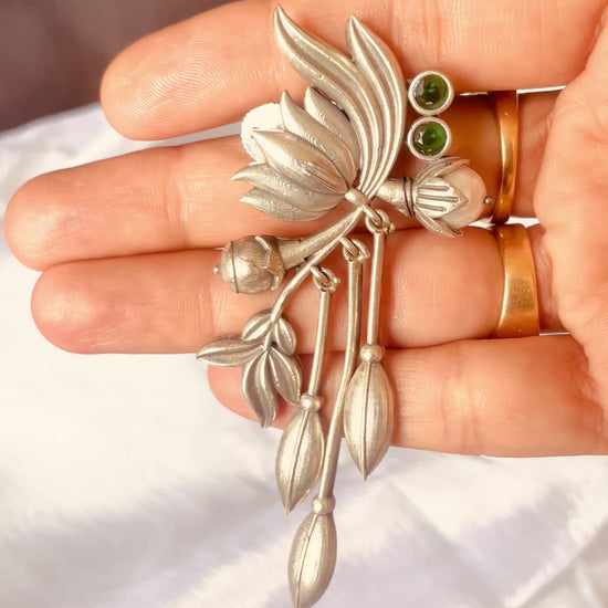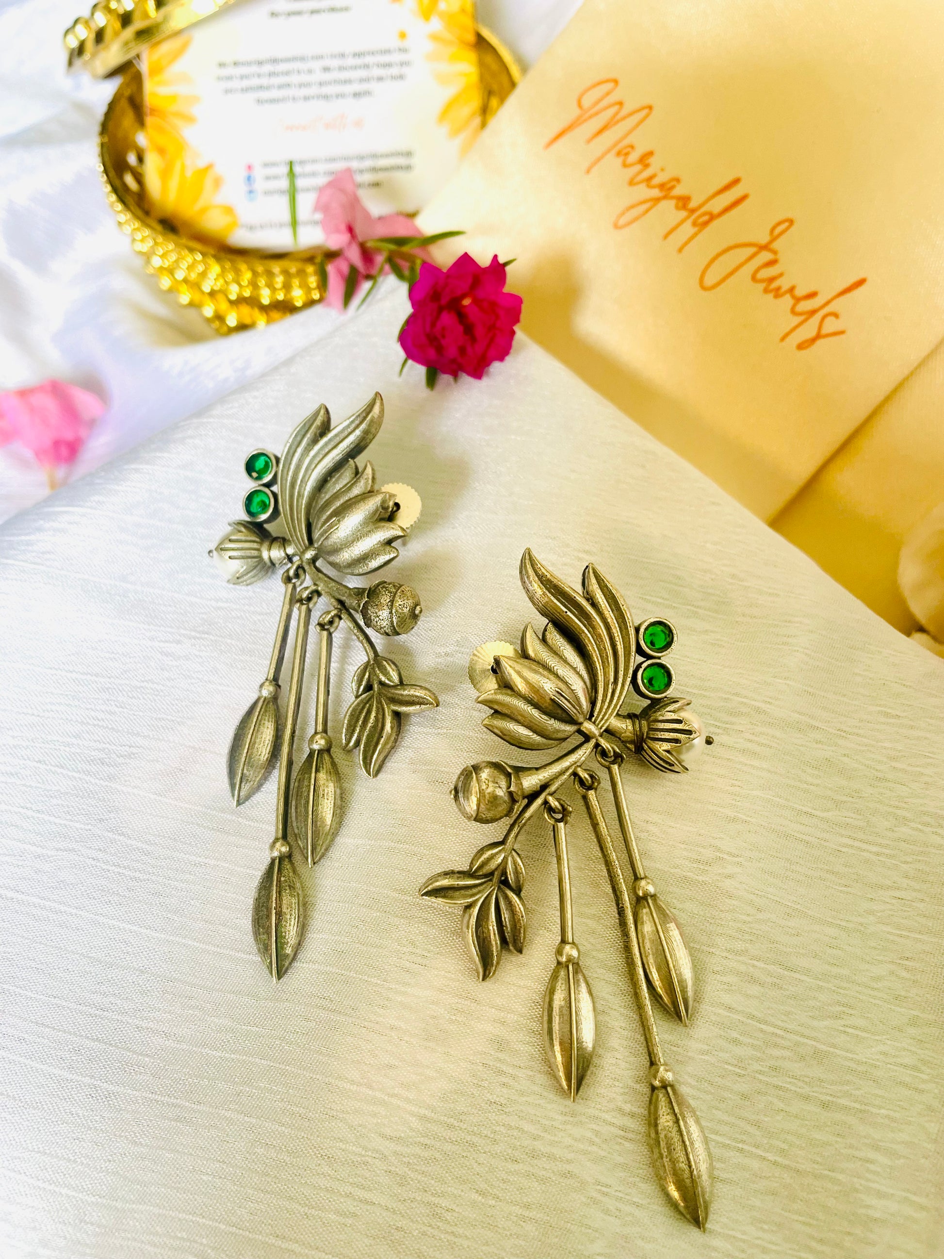 Add a touch of nature-inspired elegance with these **vintage Jal Kamal Danglers**! Crafted with intricate leaf and floral motifs, these earrings feature sparkling green stones for a pop of color. Perfect for both traditional and contemporary looks! π
