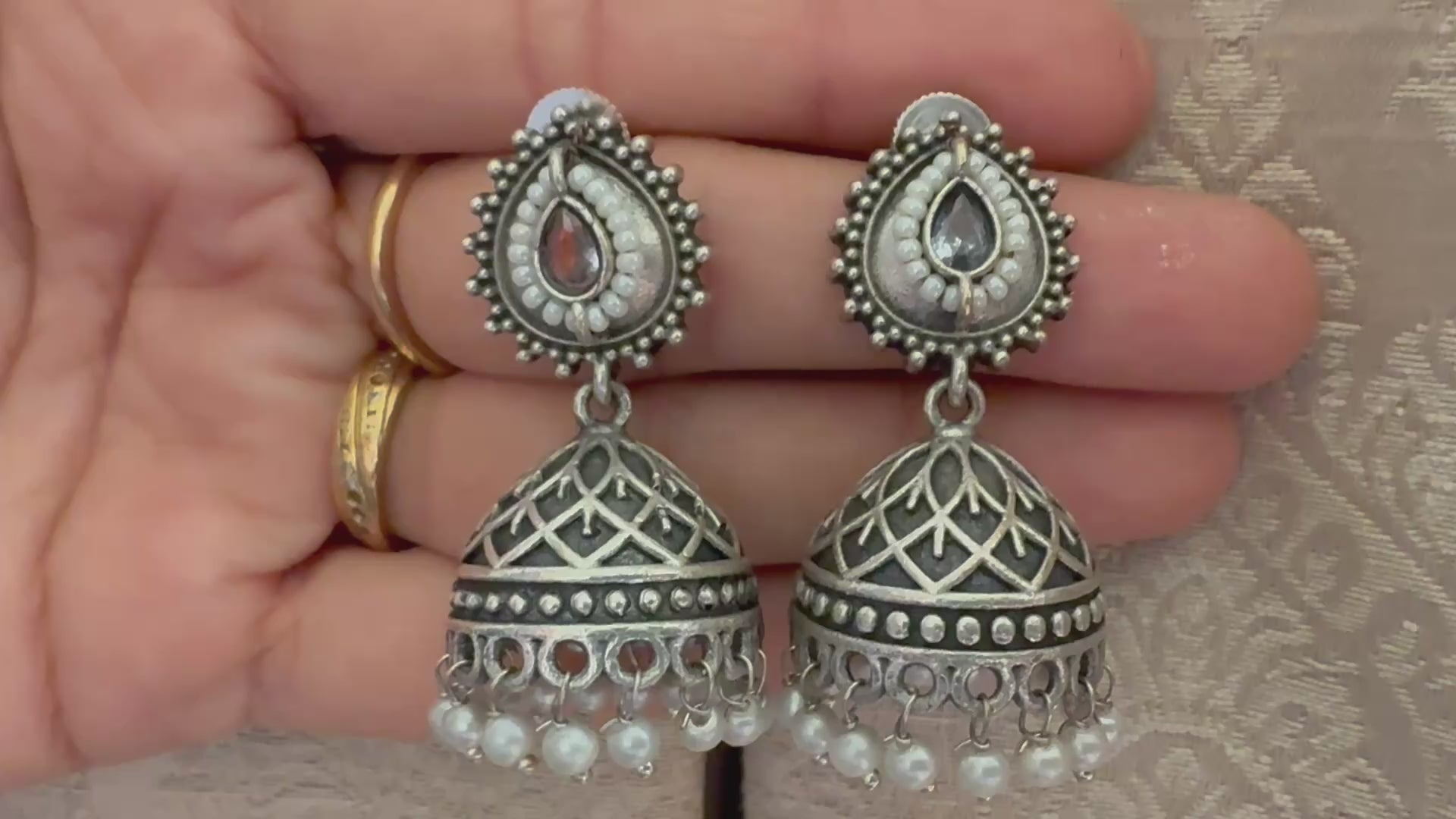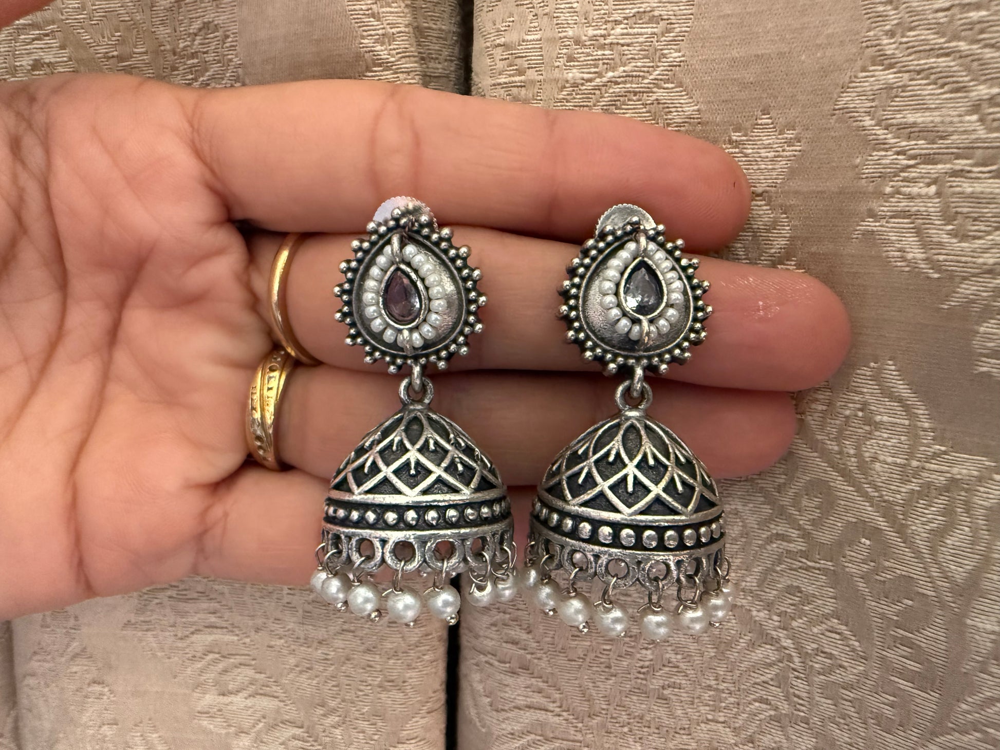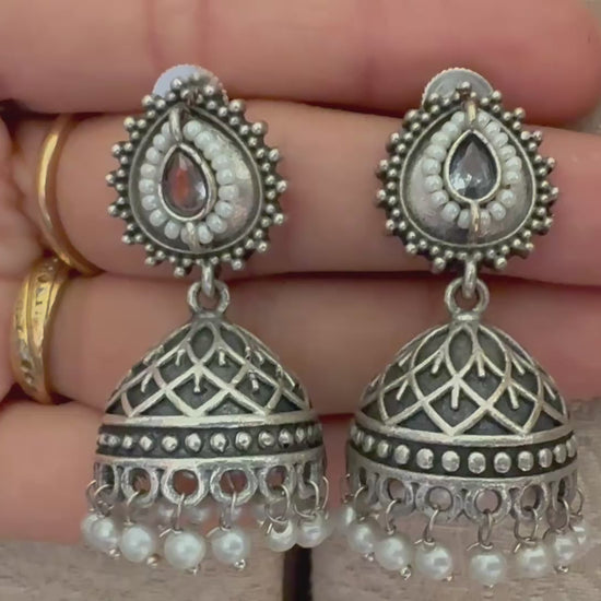 A timeless blend of grace and tradition, these oxidized silver jhumkas feature a teardrop motif adorned with stone detailing, crowned by intricate latticework domes and finished with dainty pearl droplets. Perfect for adding an old-world charm to modern celebrations. 🌸
