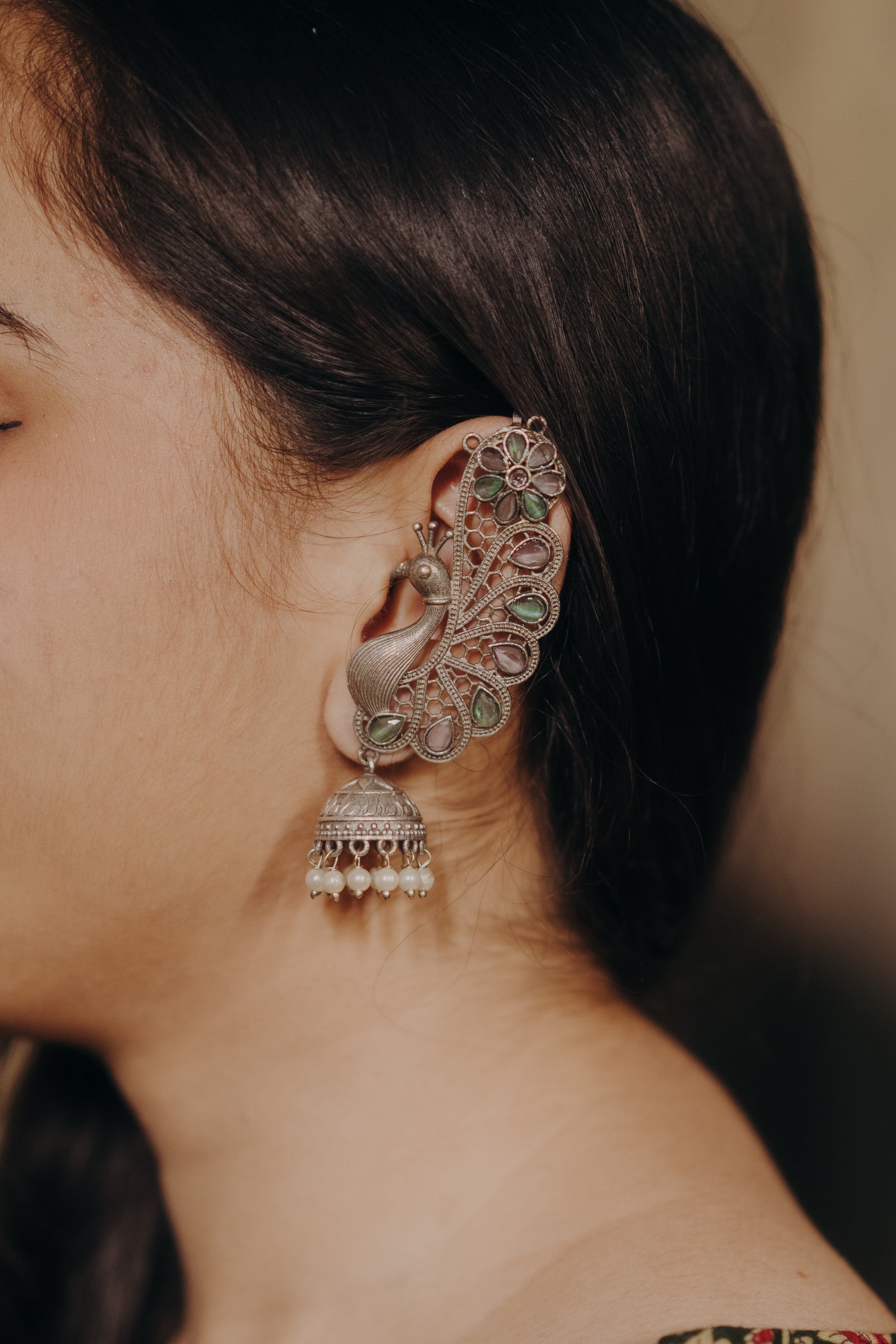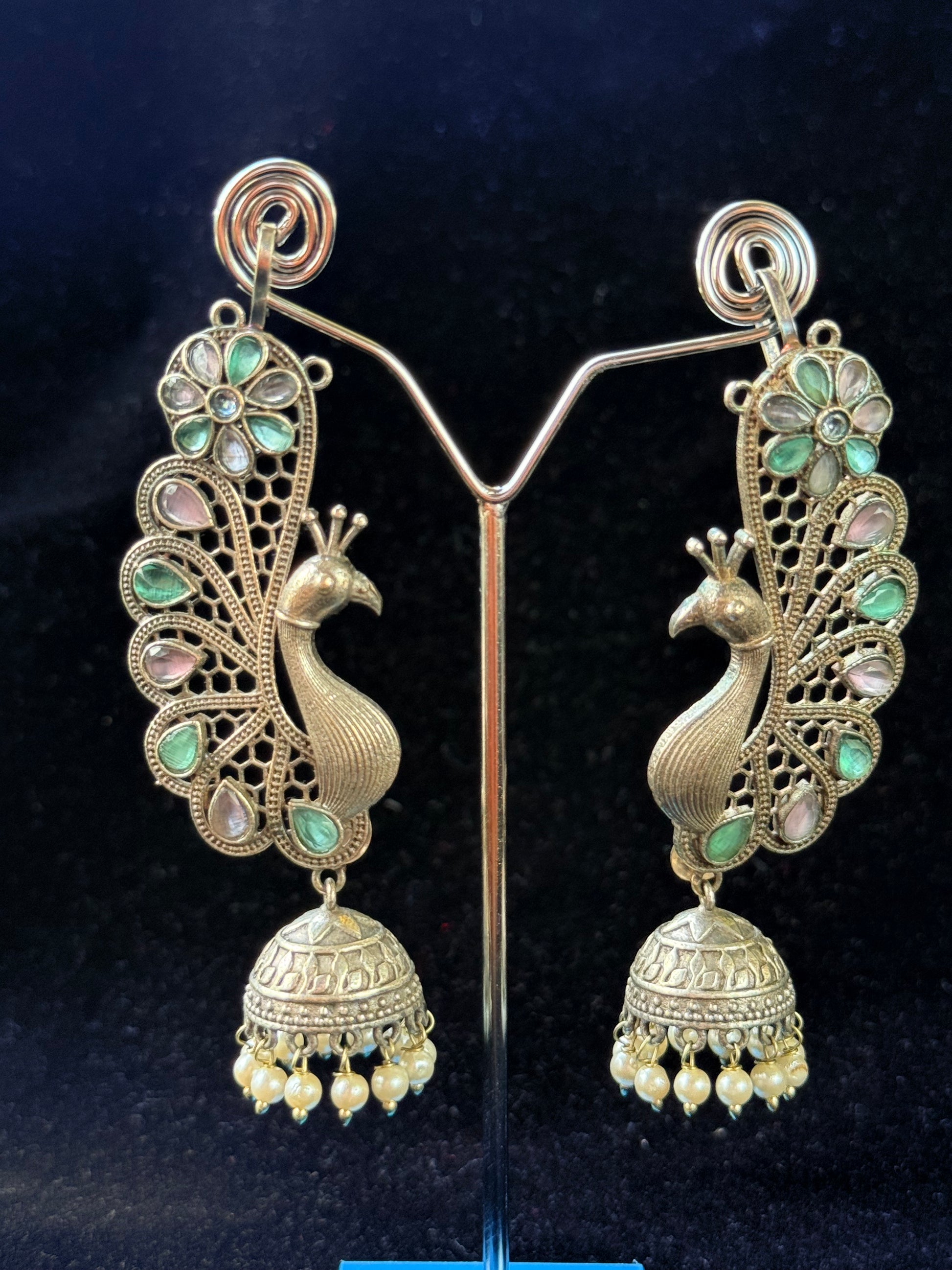 Stunning silver earrings shaped like majestic peacocks, embellished with pastel pink and green stones on the feathers and finished with pearl drop jhumkas. The soft pink and green accents paired with antique silver create a regal and eye-catching look.
