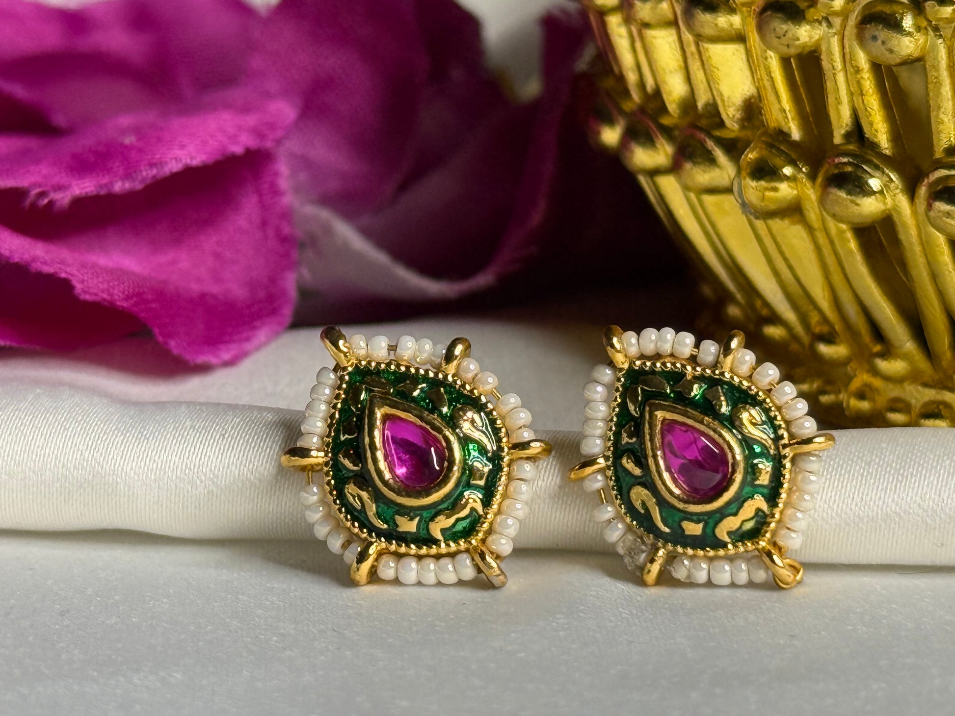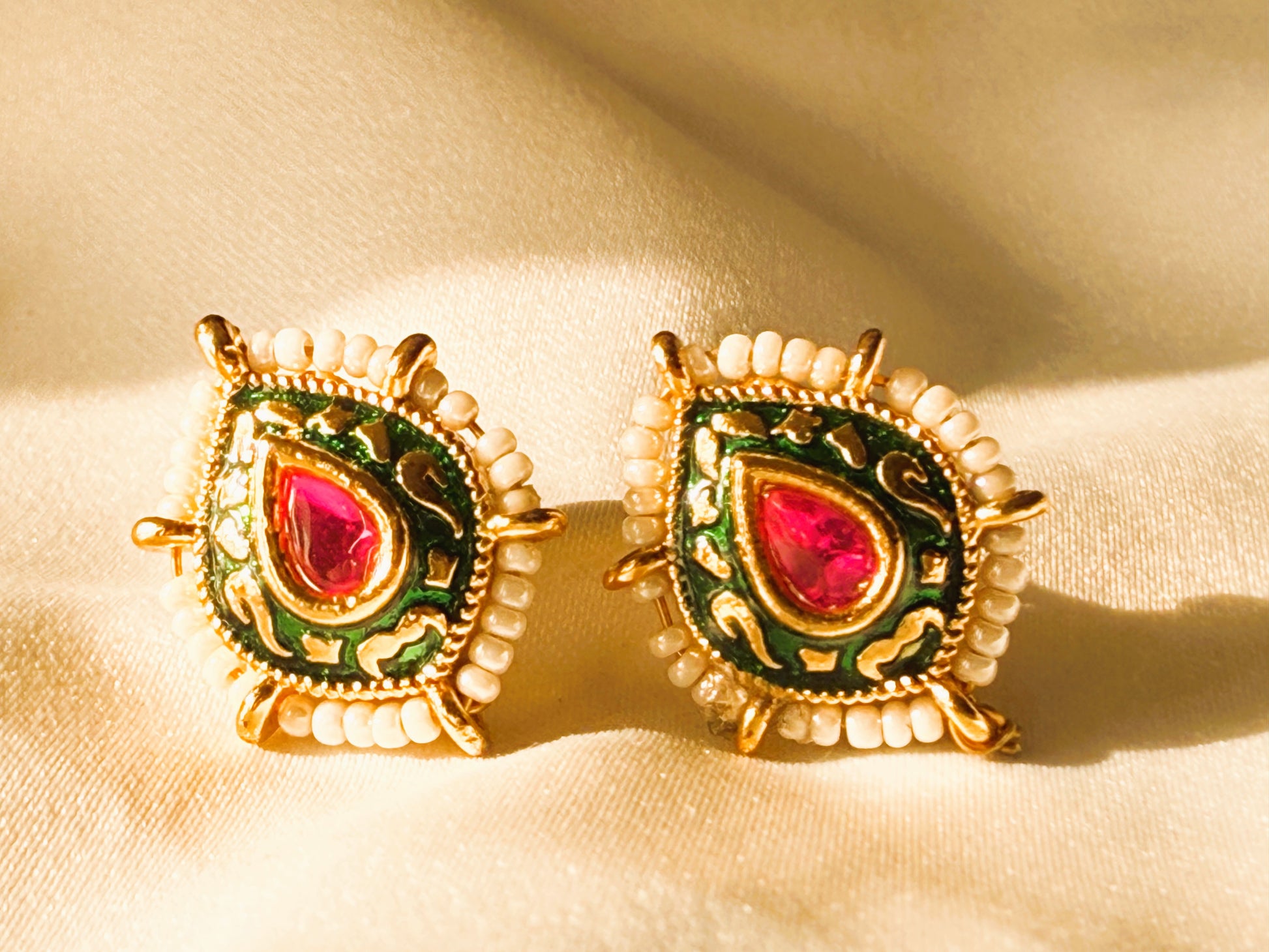 Patralekha captures the grace of nature carved in gold. With a vivid green center like morning dew on a fresh leaf, bordered by pearls and rich red enamel, these earrings are a tribute to timeless design born from the earth.