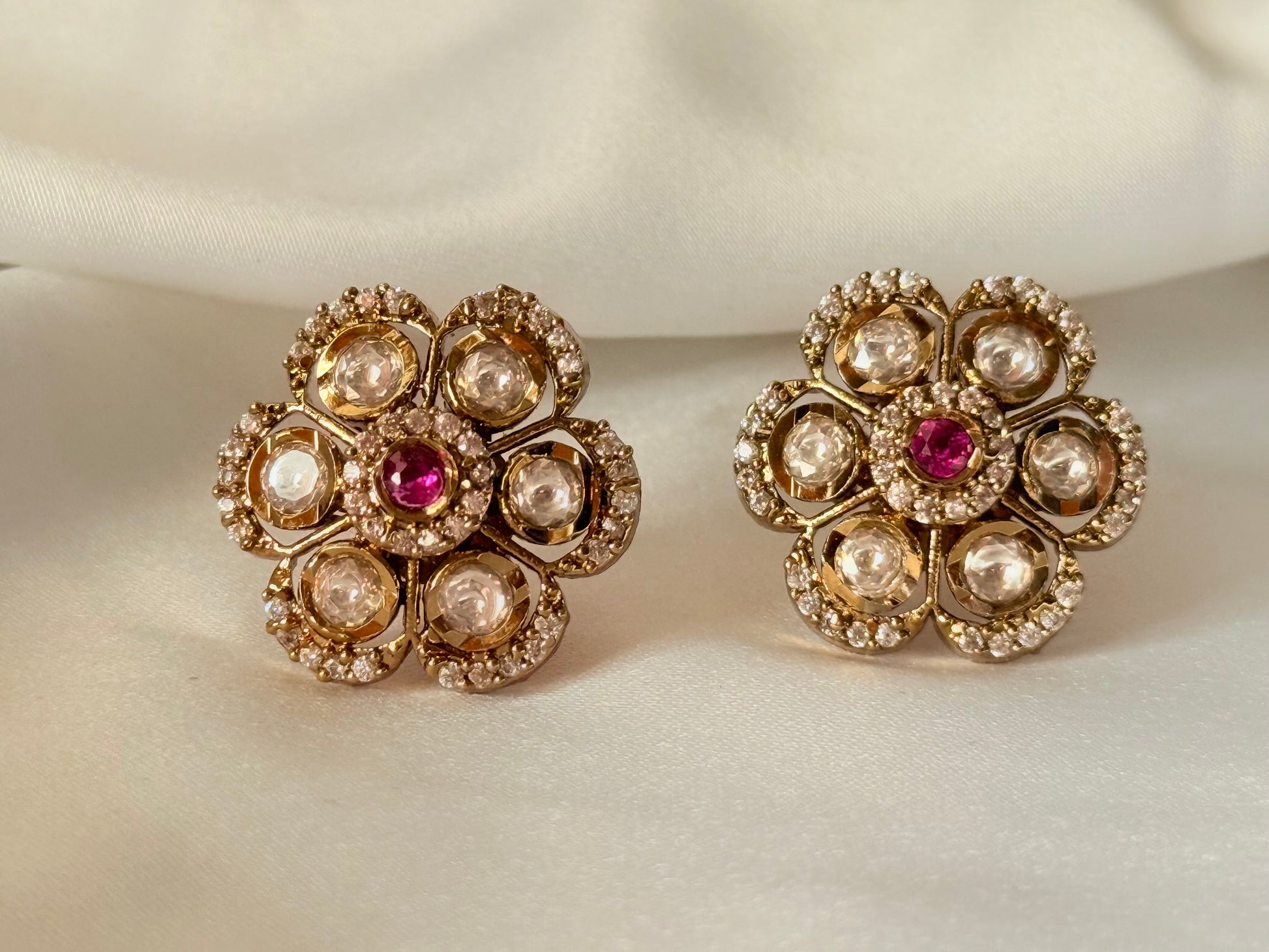 The Rajphool Studs bloom like golden flowers kissed by morning dew. Set in a radiant floral design, each petal sparkles with uncut polki stones bordered by delicate zircons, capturing the richness of tradition with a hint of modern elegance.
