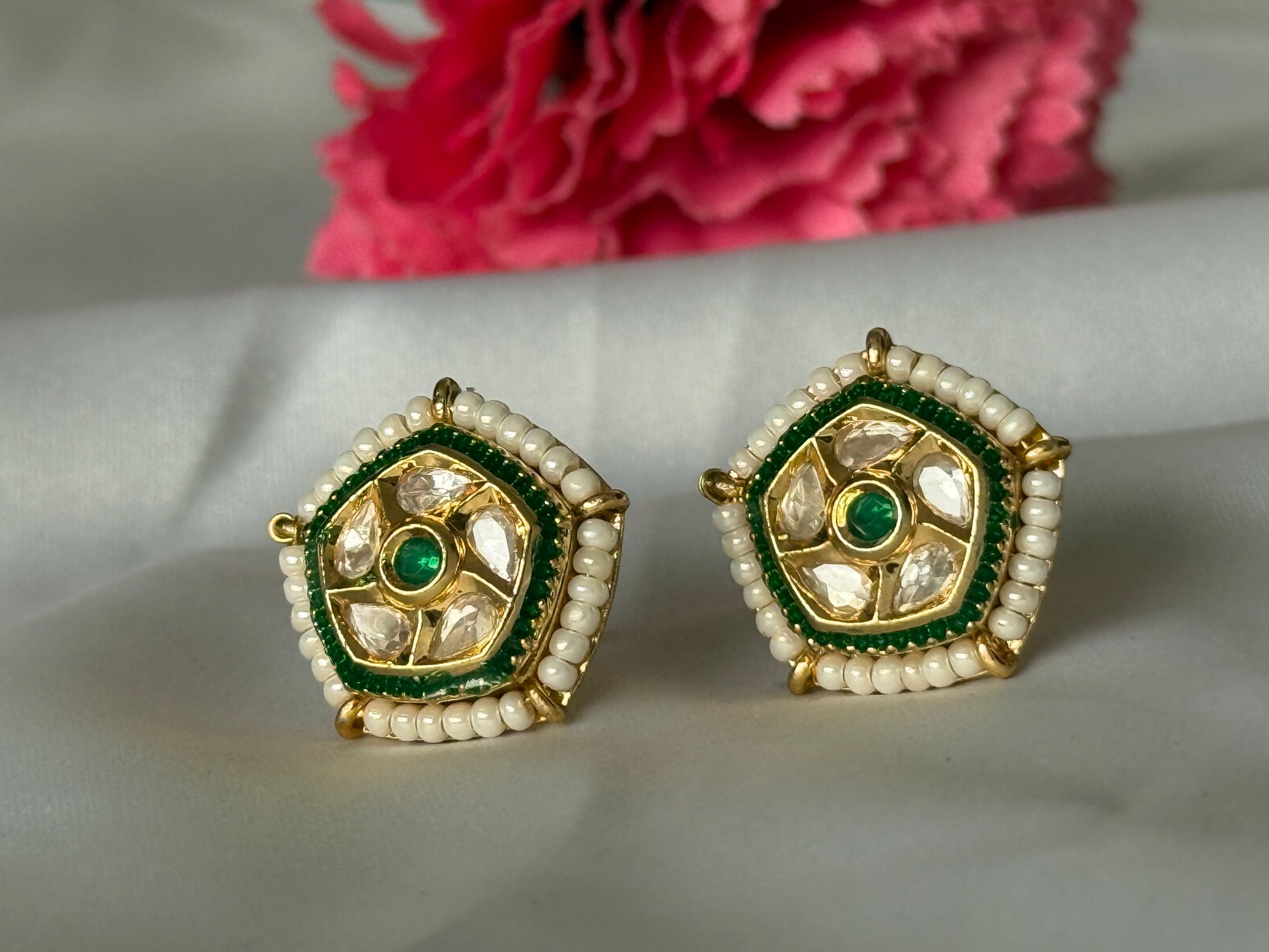 Intricately crafted with kundan stones and pearl accents, the rajsi pearl kundan studs blend regal Rajasthani artistry with timeless elegance-perfect for weddings and festive occasions.