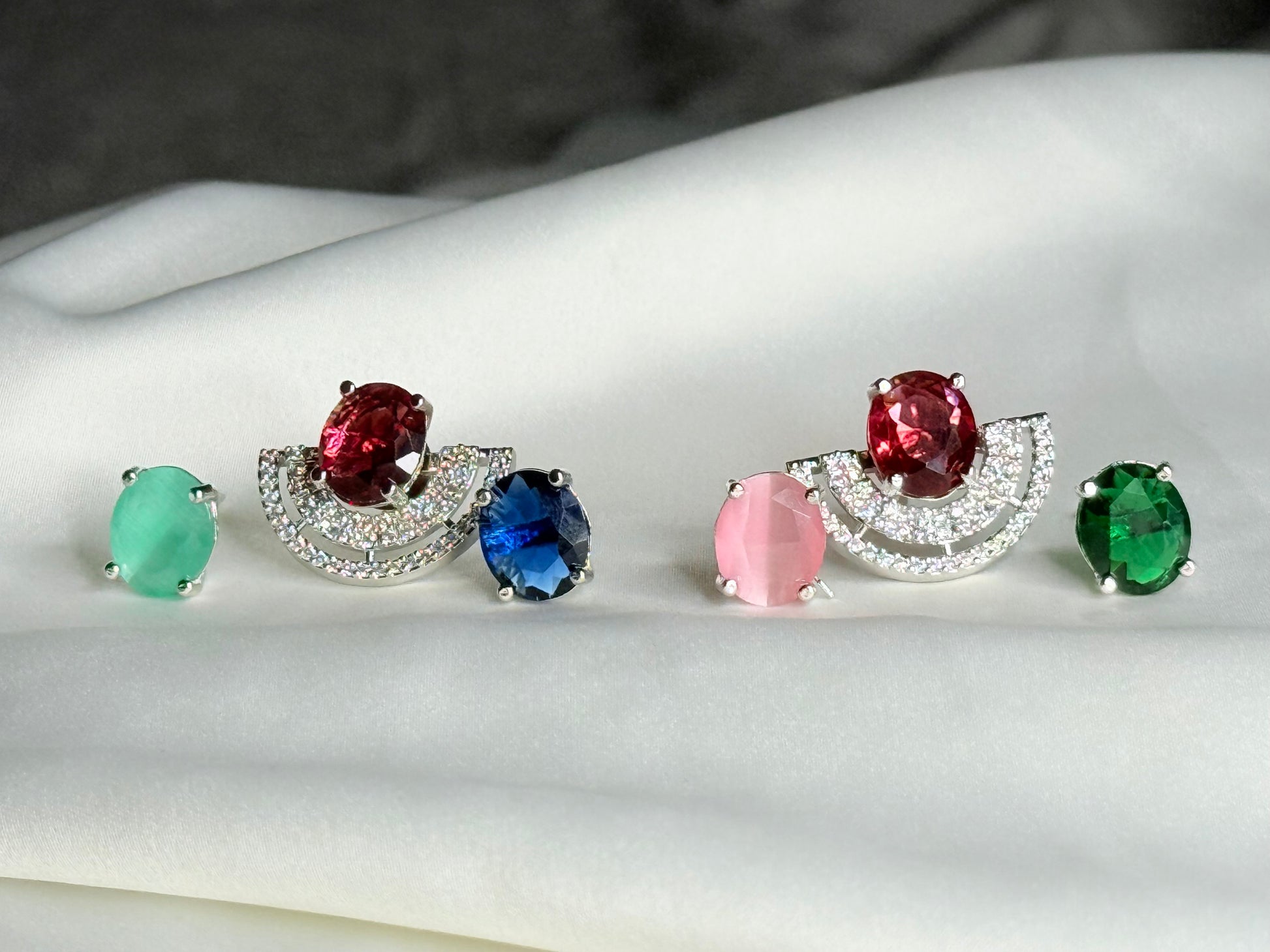 Unique and beautiful earrings with changeable studs in four different colours like sapphire, blush pink ,emerald and aquamarine ,can be worn in all type of occasions.