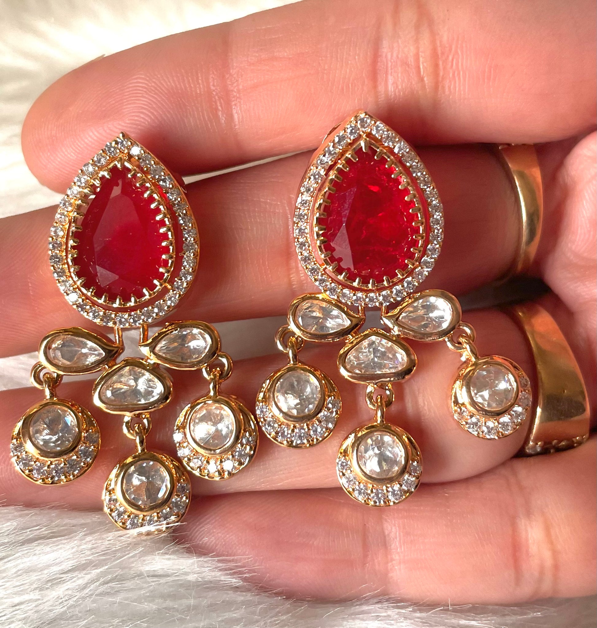 Luxurious drop earrings crafted with a rich ruby-red centerpiece, encircled by fine zircon detailing and finished with graceful kundan-inspired danglers. Set in a radiant gold-tone base, these earrings are perfect for weddings, festive celebrations, and statement evening looks.