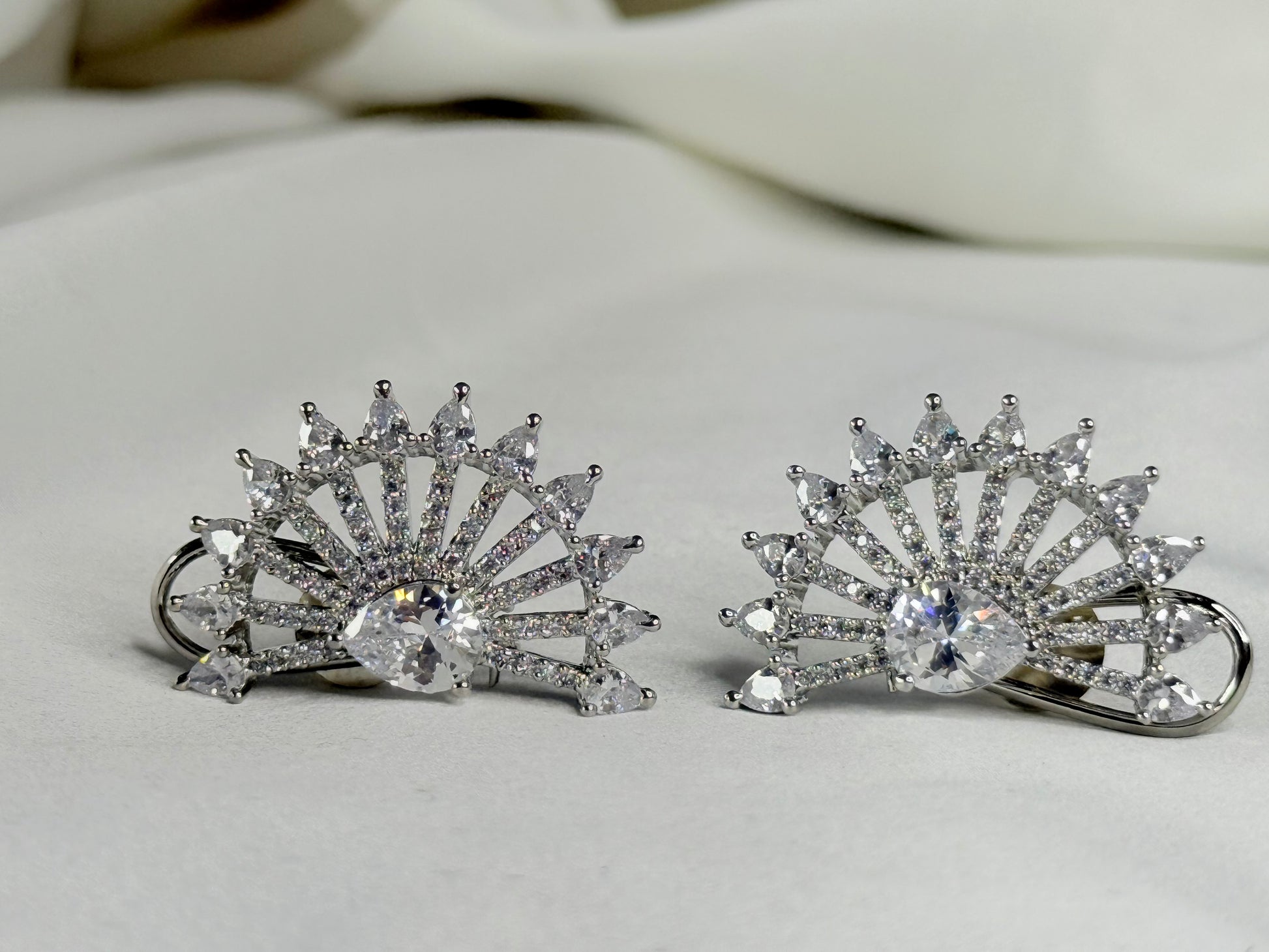 These elegant earrings feature a vibrant pear-shaped green gemstone at the center, surrounded by a radiant halo of clear stones in a sunburst design. Crafted in a sleek silver or white gold finish, they add a touch of sophistication to any outfit. Perfect for special occasions, these earrings are sure to make a statement.