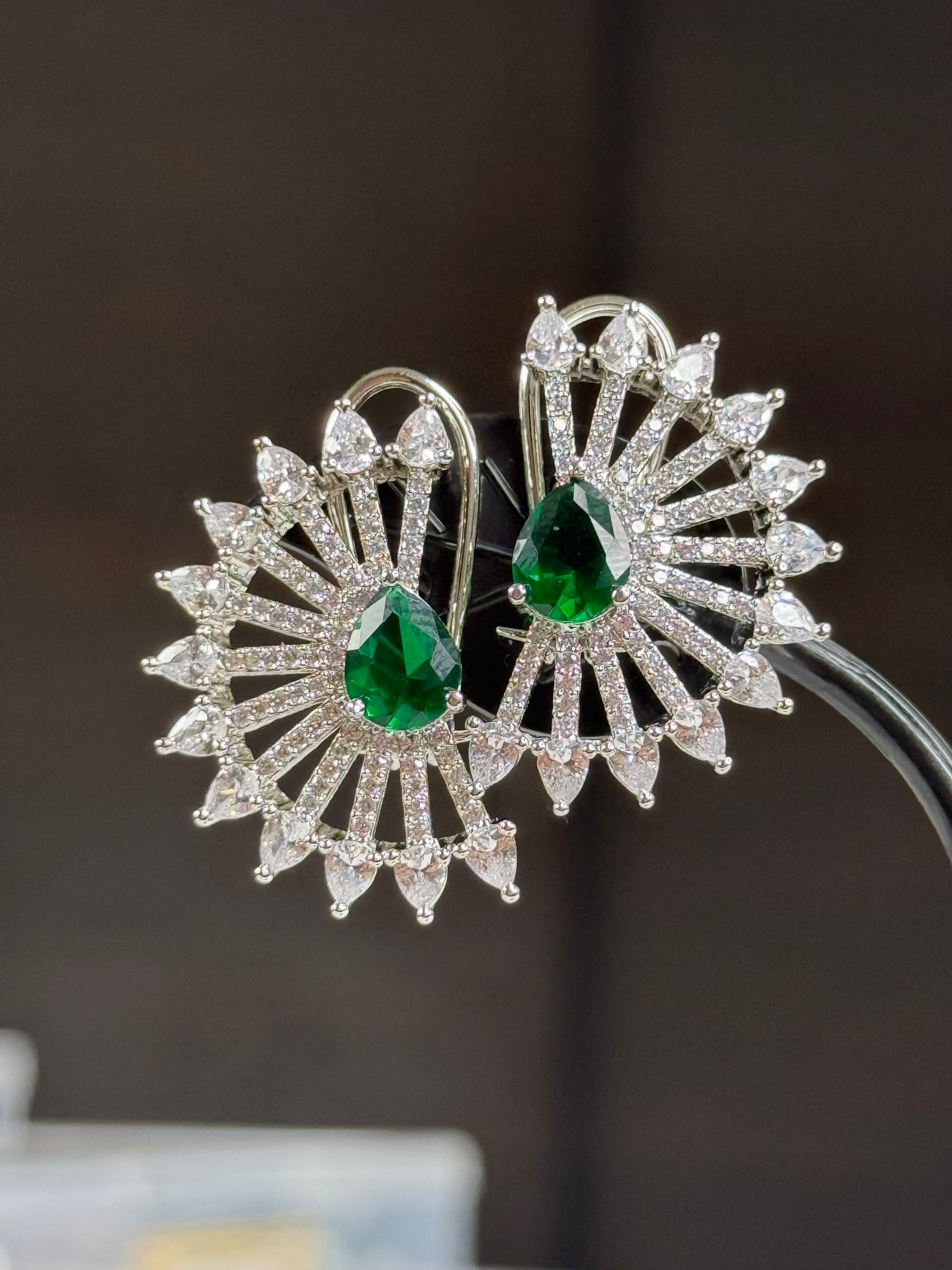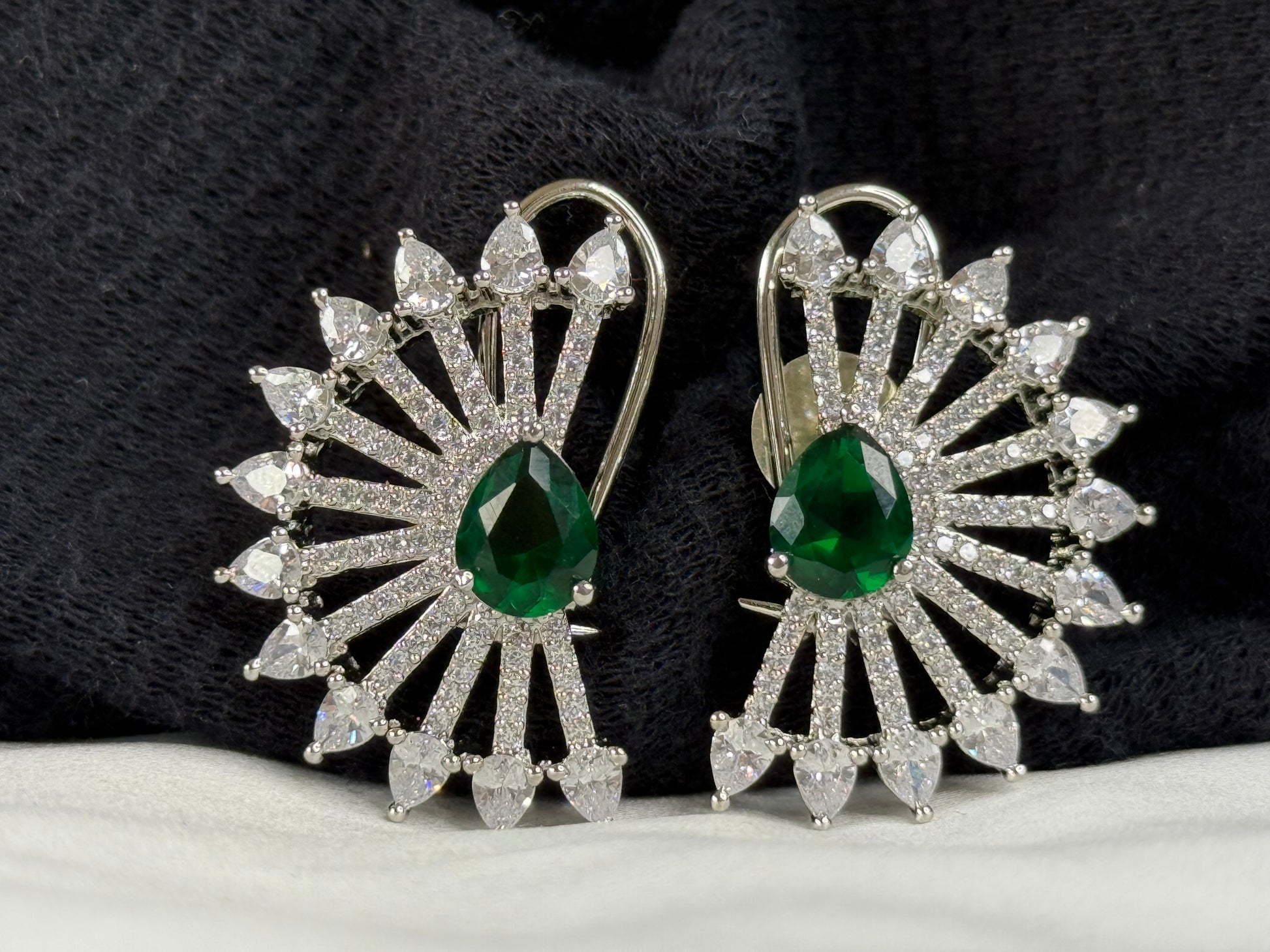 These elegant earrings feature a vibrant pear-shaped green gemstone at the center, surrounded by a radiant halo of clear stones in a sunburst design. Crafted in a sleek silver or white gold finish, they add a touch of sophistication to any outfit. Perfect for special occasions, these earrings are sure to make a statement.