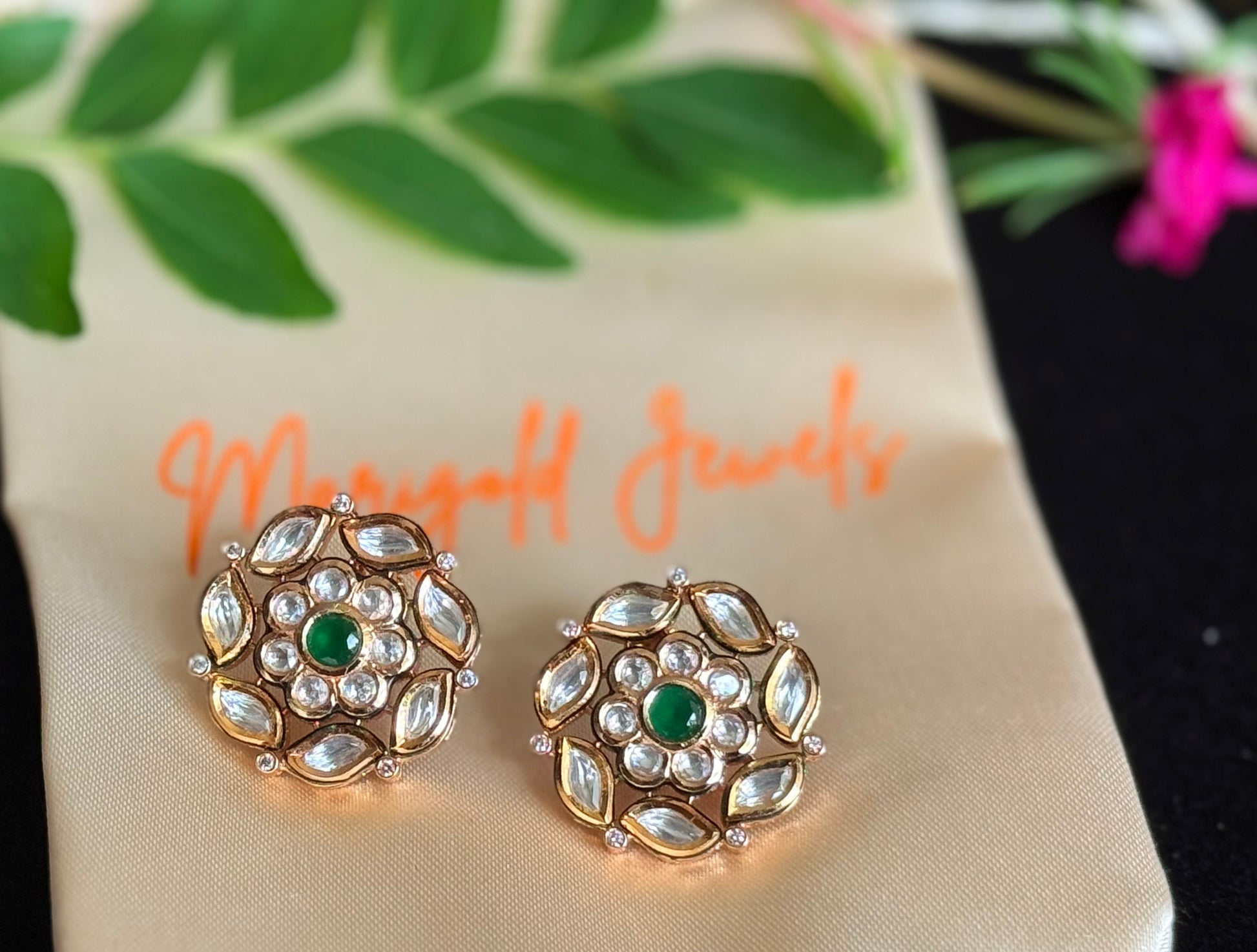 Graceful as a golden bloom, the Zarin Petal Studs capture the allure of polki brilliance and emerald elegance — a perfect blend of heritage and luxury for the festive season.